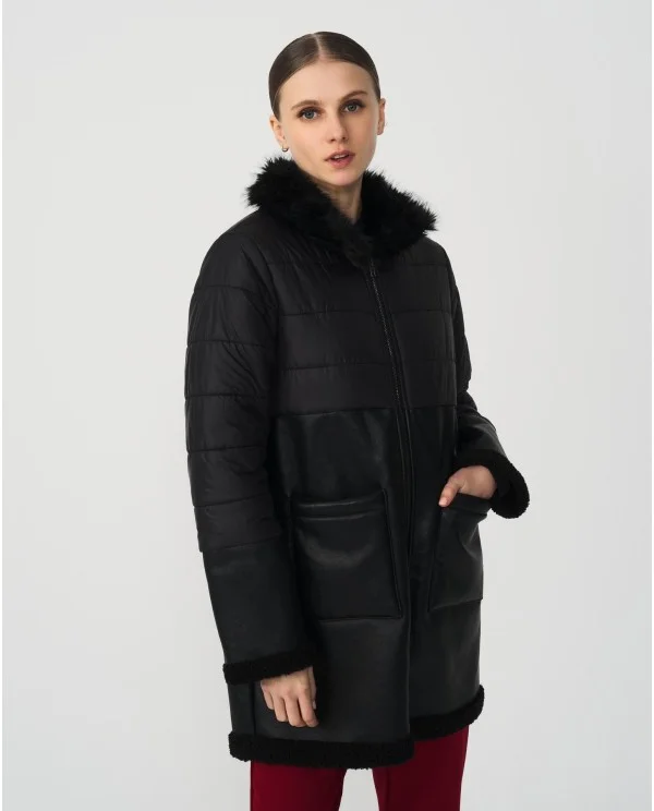 Parka diseñada en polipiel en color negro ,cierre frontal con cremallera metálica, diseño panelado, incorpora un cuello de pelo , cuenta con dos bolsillos laterales. Un abrigo que será un must este otoño-invierno.