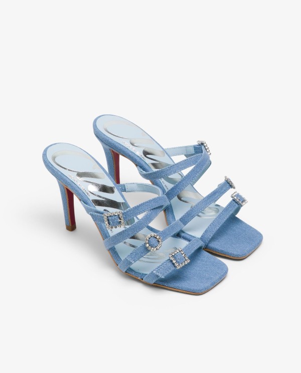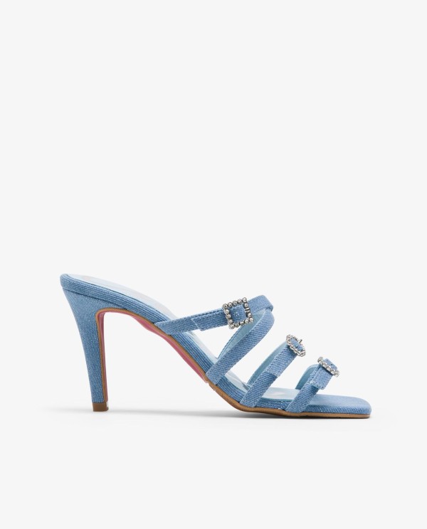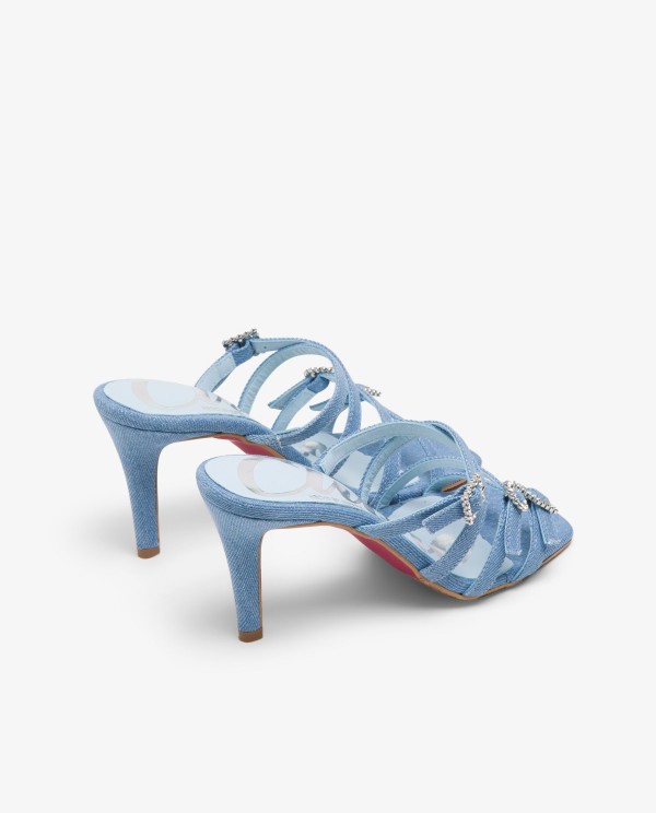 Sandalia pala en denim, con tirantes adelante y adornos de hebillas. Ideales para lucir con vaqueros, y darle un toque diferente a tus looks.